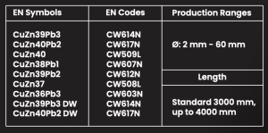 CW004A (Cu-ETP), CW307G (CuAl10Ni5Fe4), CW308G (CuAl11Fe6Ni6), CW506L (CuZn33), CW507L (CuZn36), CW508L (CuZn37), CW509L (CuZn40), CW510L (CuZn42), CW511L (CuZn38As), CW602N (CuZn36Pb2As) DZR, CW603N (CuZn36Pb3), CW606N (CuZn37Pb2), CW607N (CuZn38Pb1), CW608N (CuZn38Pb2), CW612N (CuZn39Pb2), CW614N (CuZn39Pb3), CW614N-DW (CuZn39Pb3), CW617N (CuZn40Pb2), CW617N-DW (CuZn40Pb2), CW623N (CuZn43Pb2), CW719R (CuZn39Sn1), CW724R (CuZn21Si3P), CW725R (CuZn33Pb1AlSiAs) DZR