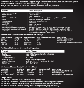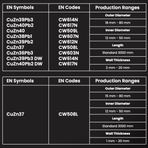 | Alloy | CW004A (Cu-ETP), CW307G (CuAl10Ni5Fe4), CW308G (CuAl11Fe6Ni6), CW506L (CuZn33), CW507L (CuZn36), CW508L (CuZn37), CW509L (CuZn40), CW510L (CuZn42), CW511L (CuZn38As), CW602N (CuZn36Pb2As) DZR, CW603N (CuZn36Pb3), CW606N (CuZn37Pb2), CW607N (CuZn38Pb1), CW608N (CuZn38Pb2), CW612N (CuZn39Pb2), CW614N (CuZn39Pb3), CW614N-DW (CuZn39Pb3), CW617N (CuZn40Pb2), CW617N-DW (CuZn40Pb2), CW623N (CuZn43Pb2), CW719R (CuZn39Sn1), CW724R (CuZn21Si3P), CW725R (CuZn33Pb1AlSiAs) DZR |